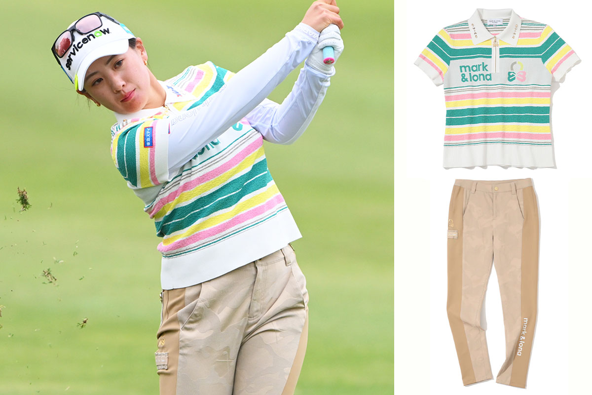 トータル10万円超! 金田久美子は“アートなカモ柄”コーデで華やかに 春コースで映えた「MARK & LONA」【女子プロファッション】